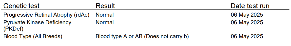 She has been genetically tested, proving she does not carry the genes associated with Progressive Retinal Atrophy or Pyruvate Kinase Deficiency, meaning she and her offspring will live long, happy lives!